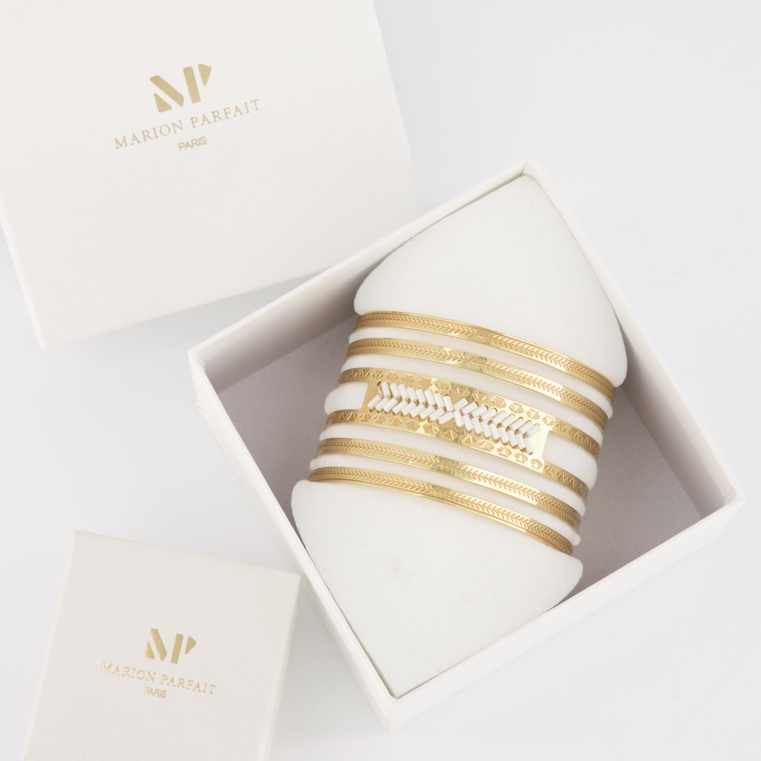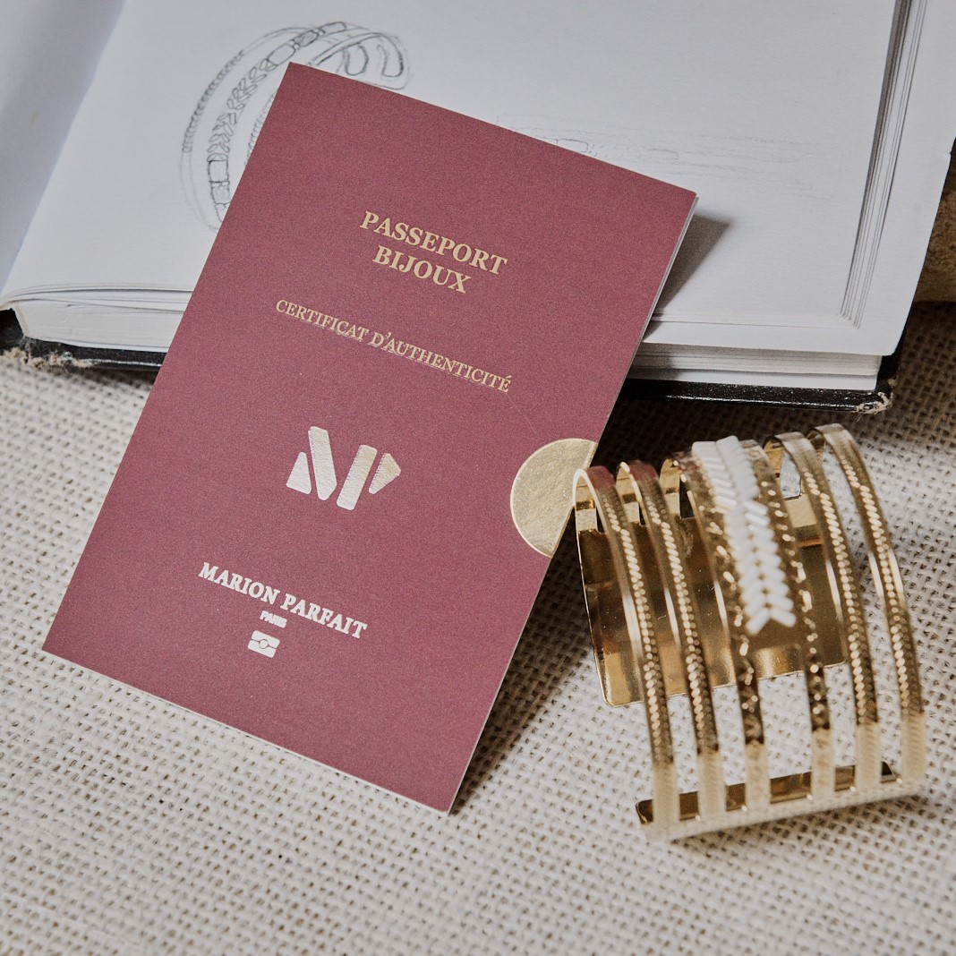Les bijoux Marion Parfait sont vendus dans un coffret blanc ivoire perlé, avec une mousse protectrice et accompagnés d’un Passeport certificat d’authenticité estampillé du logo de la Maison.