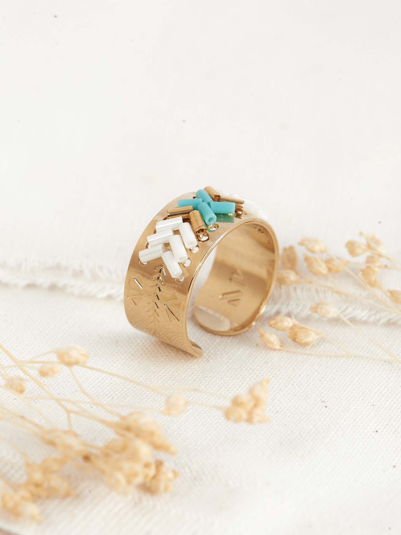 Ama signifie « Eau » en langage Cherokee. Cette bague en laiton doré brodé de perles du Japon fait partie des bijoux Artefacts de la collection. Imposante et élégante, elle sait sublimer et se faire remarquer.