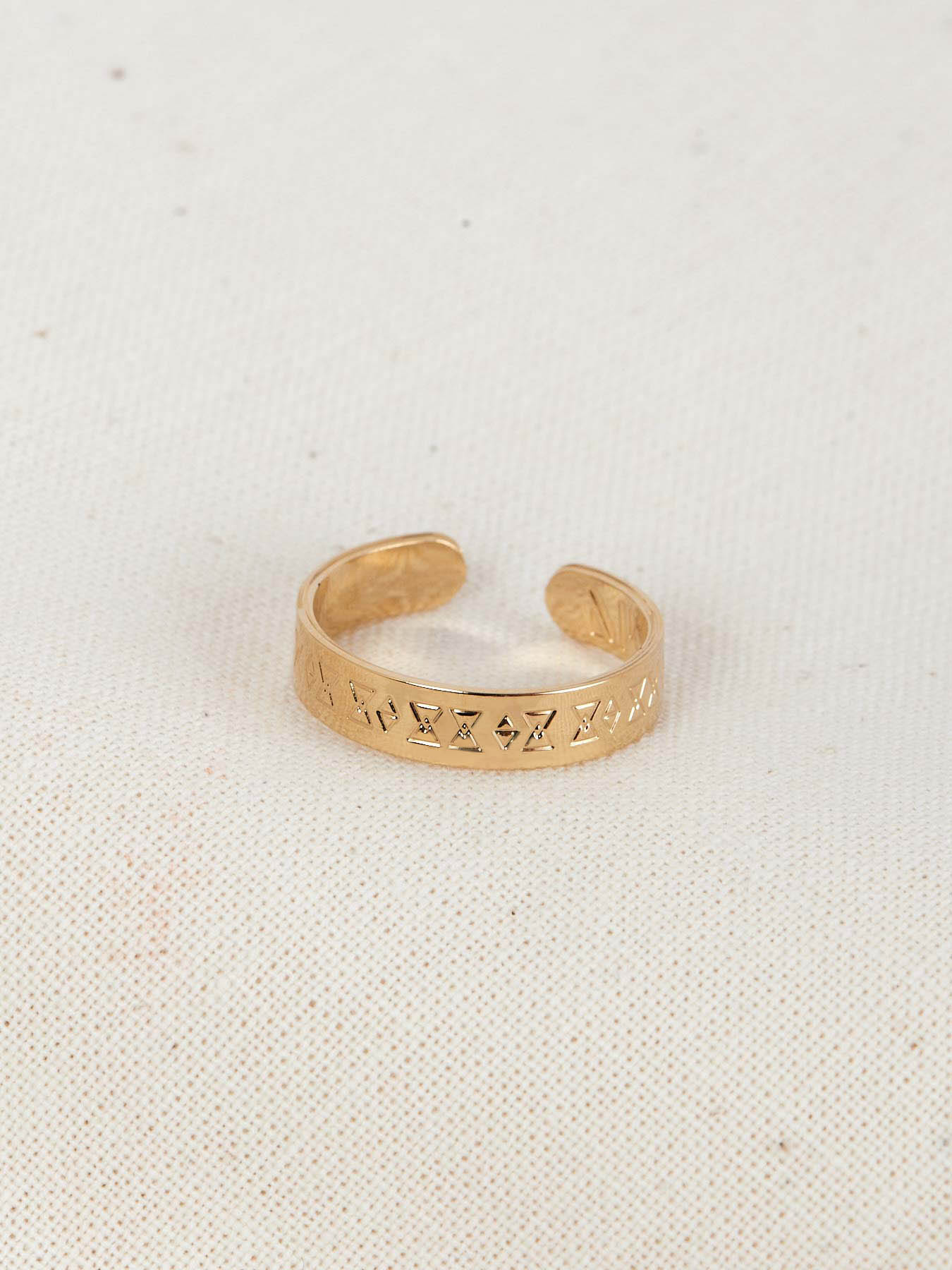 Asha signifie « Espoir » en langue de la tribu Nord Amérindienne Blackfoot. Cette petite bague de phalange est sobre et élégante, elle est faite de laiton doré gravé de motifs s’inspirant de l’art des Indiens d’Amérique du Nord. Elle vous accompagne avec discrétion au quotidien, ou peut se porter aisément en accumulation avec d’autres bagues de la collection. Laiton recouvert d’or 24carats.