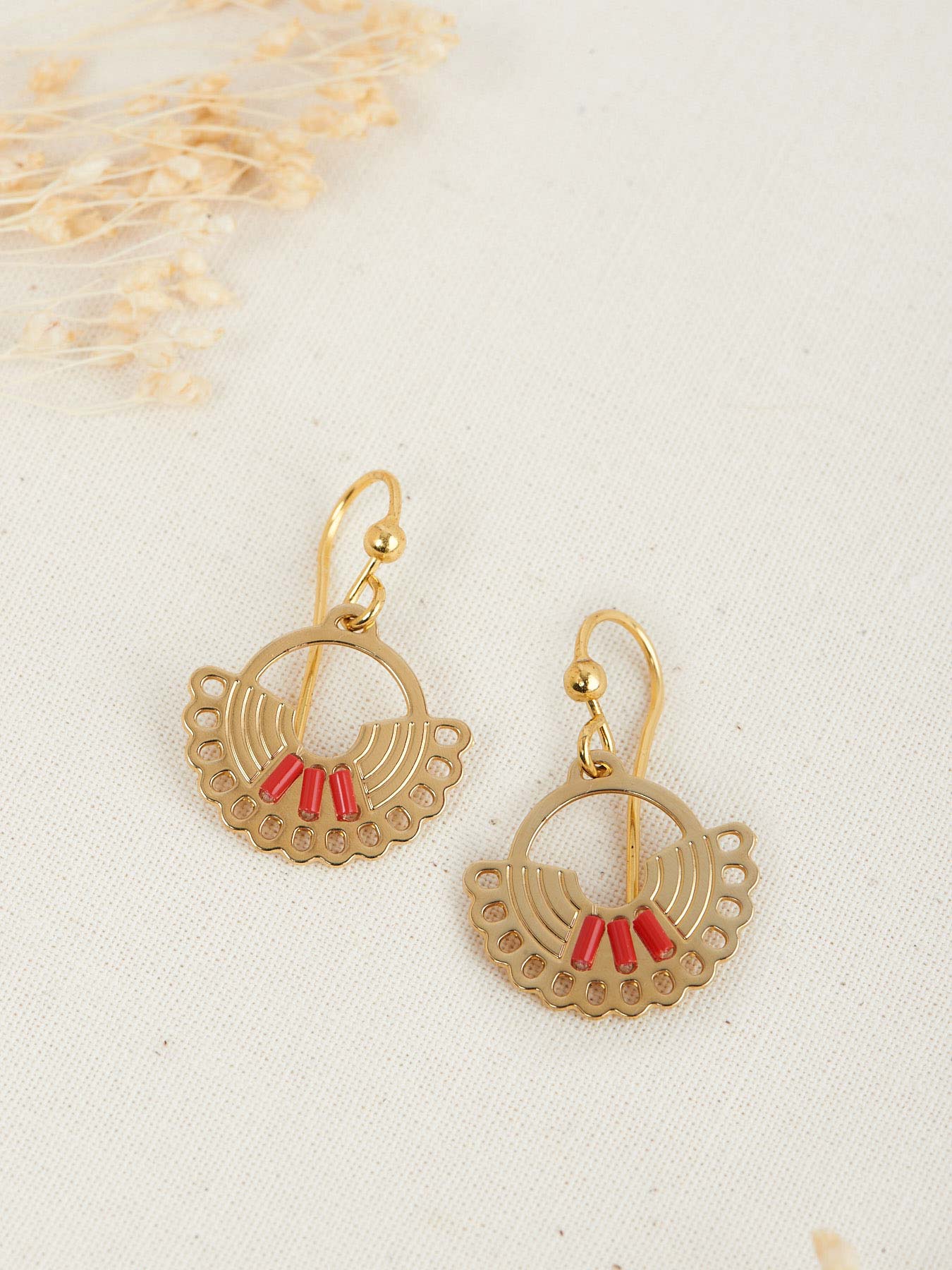 En langue de la tribu native Américaine Miwok, Lise signifie « Celle qui se lève au dessus de l’eau ». Ces jolies boucles sont composées d’une pièce de laiton dorée à la forme évoquant le soleil, brodée de perles du Japon, elle est légère et élégante. Laiton recouvert d’or 24carats.