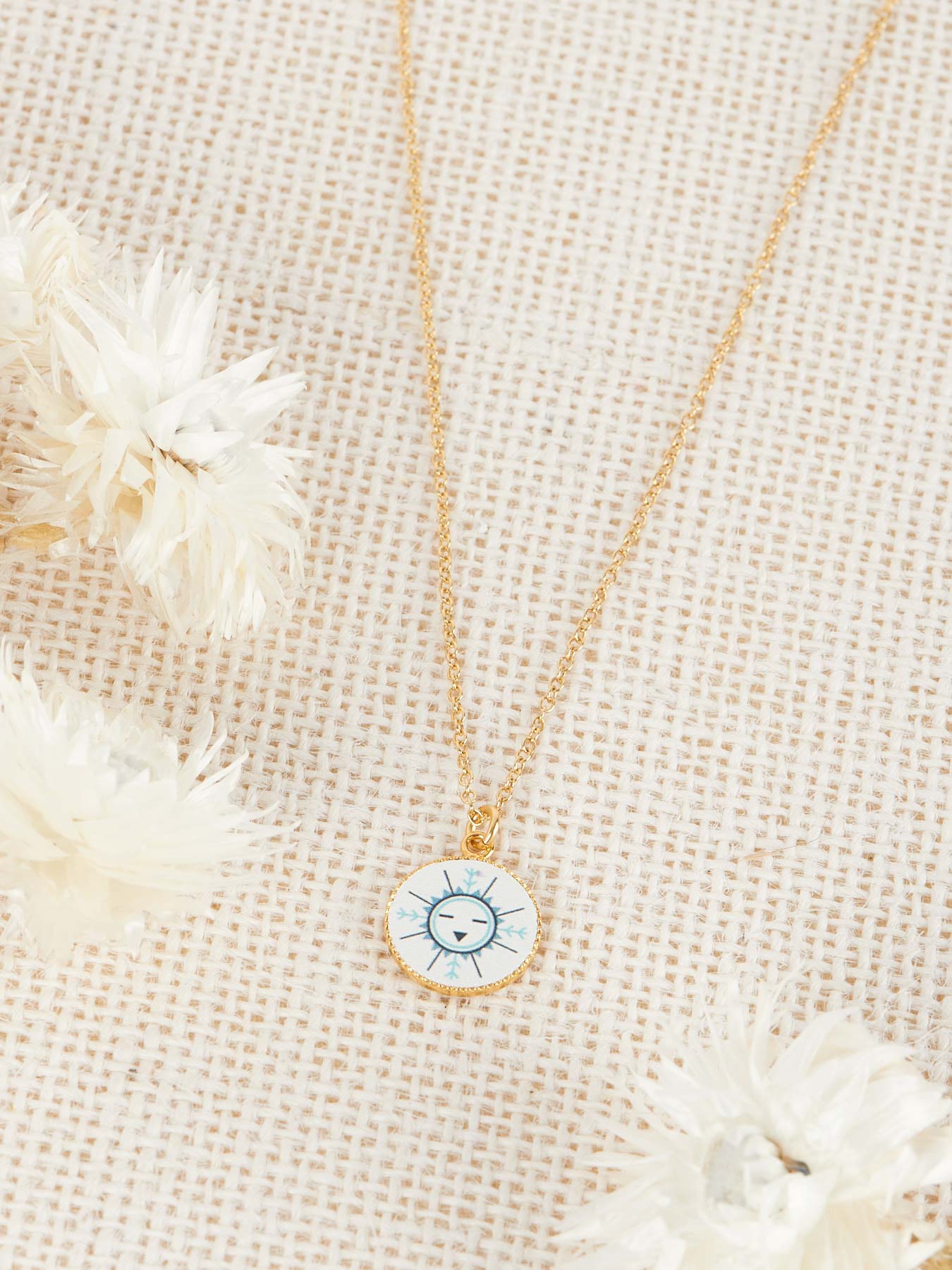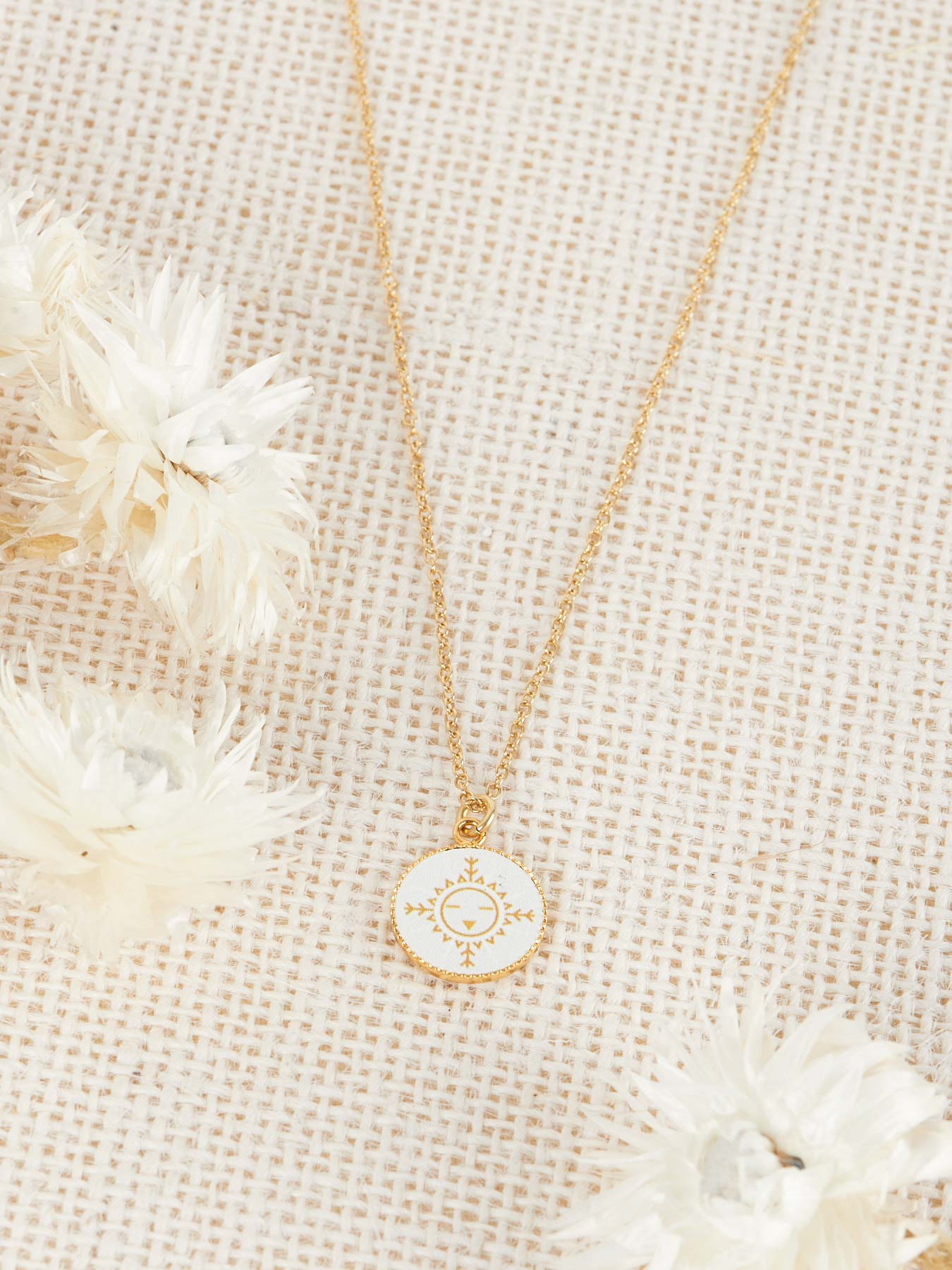 En langue de la tribu native Américaine Hopi, Una signifie « se rappeler ». En hommage aux Indiens d’Amérique et leurs arts, ce collier espiègle et discret arbore un cabochon de laiton doré dentelé orné d’un motif représentant le Dieu Soleil Hopi et Zuni. Simple et élégant, il sait s’accorder avec tout et peut être porté en accumulation avec d’autres colliers de la collection. Laiton recouvert d’or 24carats.